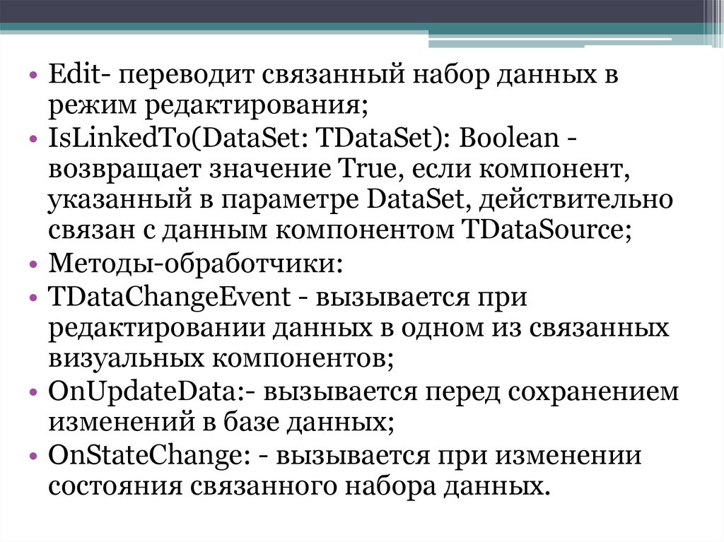 • IsLinkedTo(DataSet: TDataSet): Boolean возвращает значение True, если компонент,