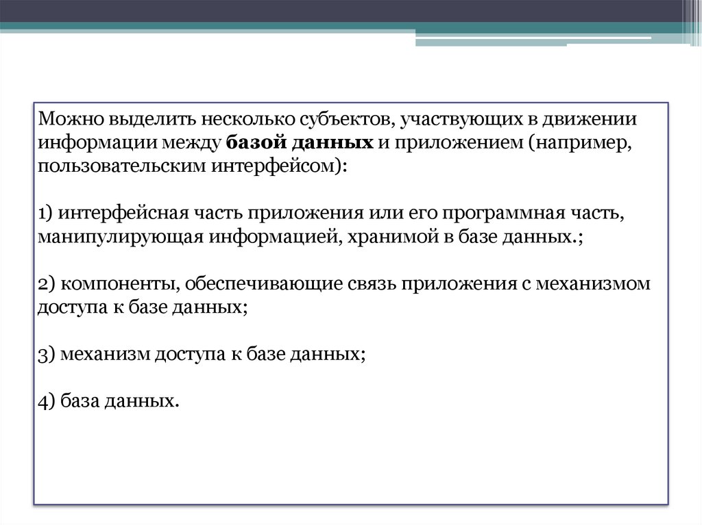 Можно выделить несколько субъектов, участвующих в движенииинформации между базой данных и приложением (например,