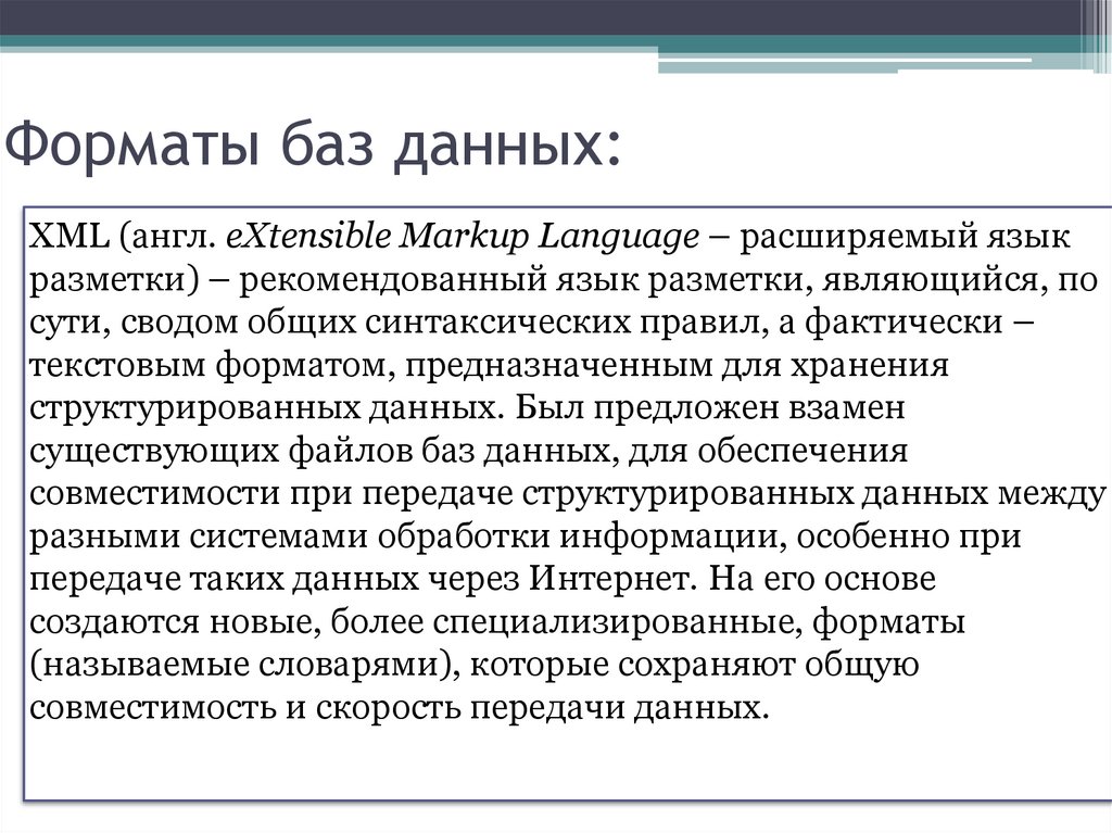 Форматы баз данных:XML (англ. eXtensible Markup Language – расширяемый язык