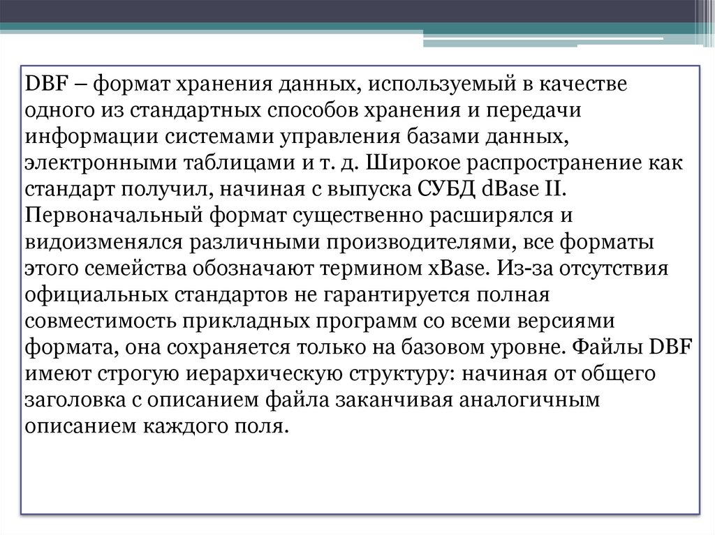 DBF – формат хранения данных, используемый в качествеодного из стандартных способов хранения и передачи
