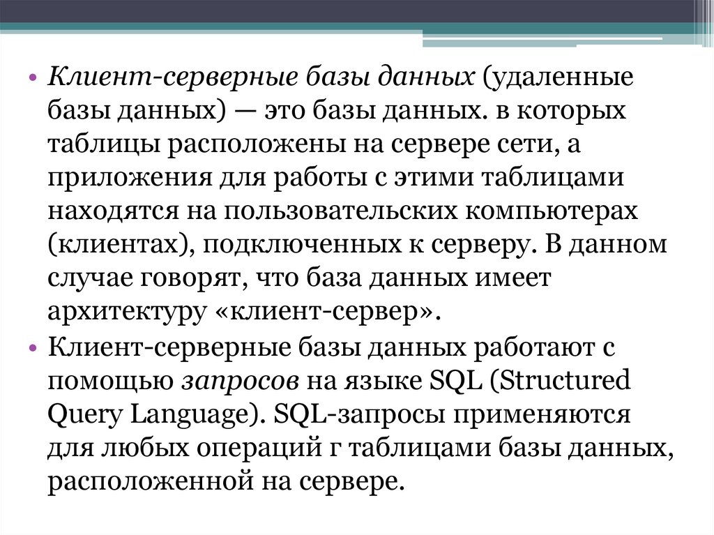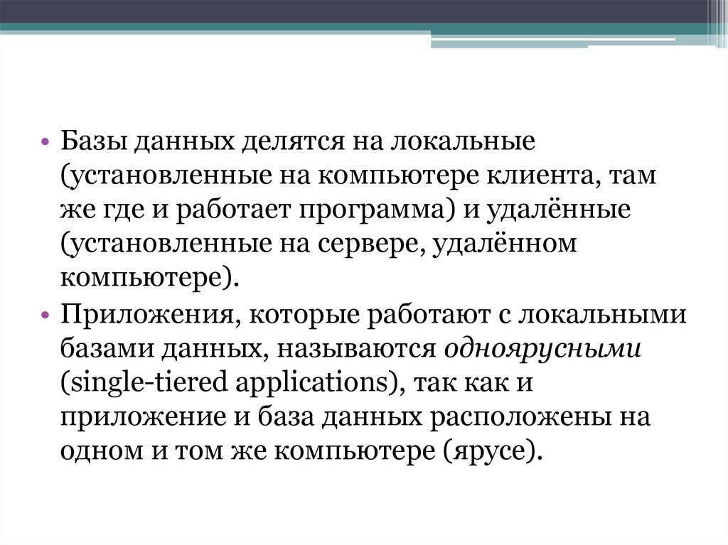 • Базы данных делятся на локальные(установленные на компьютере клиента, там