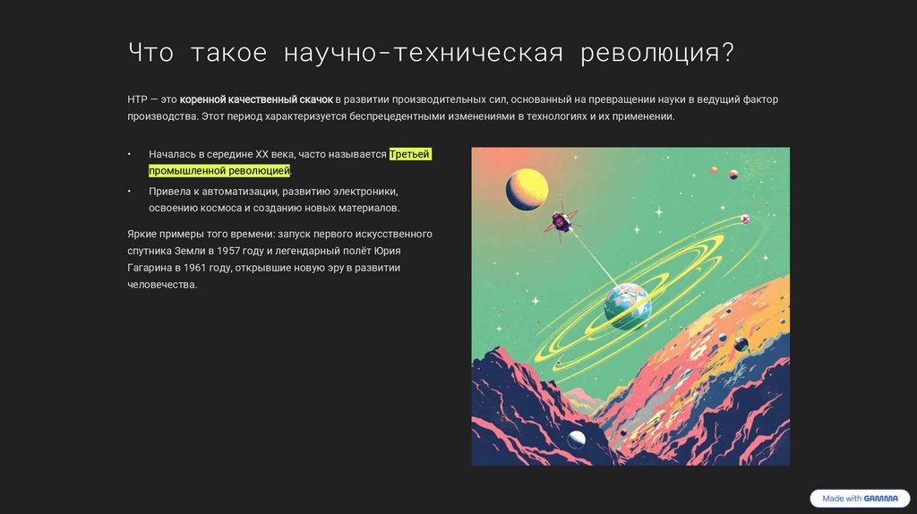 Что такое научно-техническая революция?НТР — это коренной качественный скачок в развитии производительных сил, основанный на превращении науки в ведущий фактор
