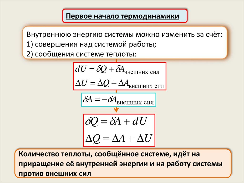 Первое начало термодинамикиВнутреннюю энергию системы можно изменить за счёт: