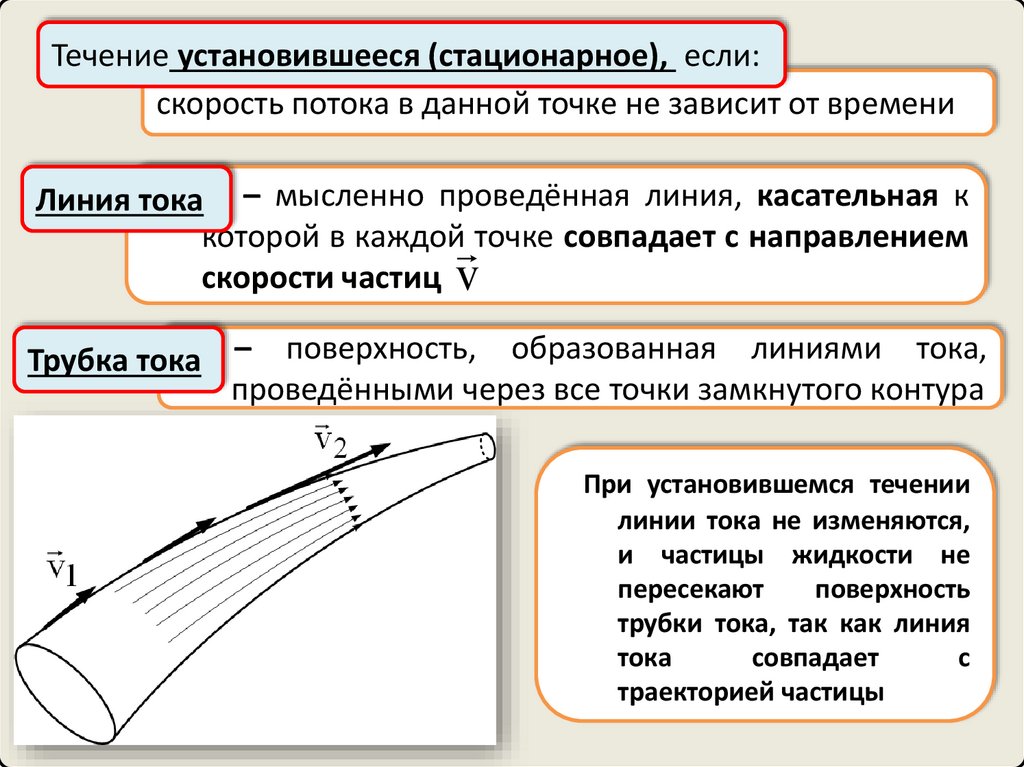Течение установившееся (стационарное), если:скорость потока в данной точке не зависит от времени