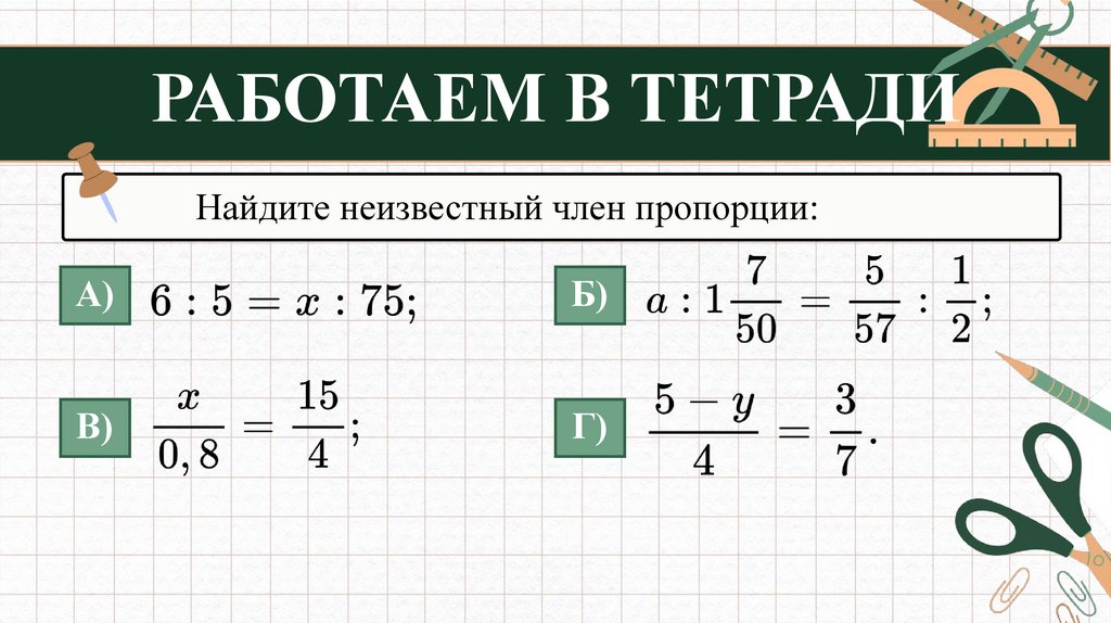 РАБОТАЕМ В ТЕТРАДИНайдите неизвестный член пропорции: