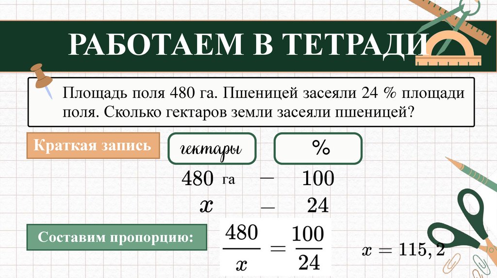 РАБОТАЕМ В ТЕТРАДИПлощадь поля 480 га. Пшеницей засеяли 24 % площади