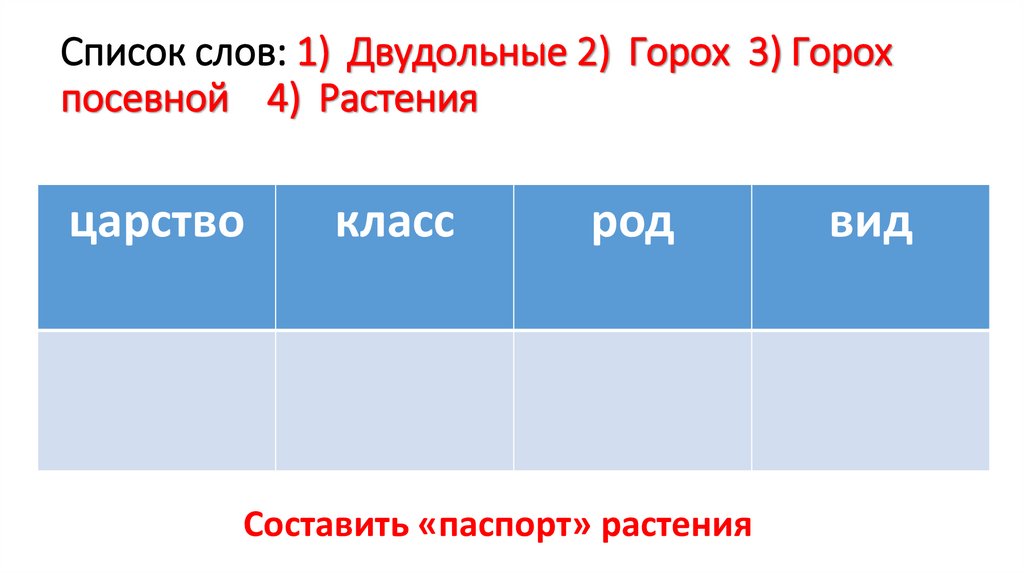 Список слов: 1) Двудольные 2) Горох 3) Горохпосевной 4) Растения