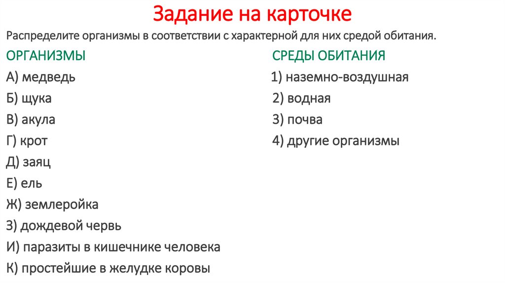 Задание на карточкеРаспределите организмы в соответствии с характерной для них средой обитания.