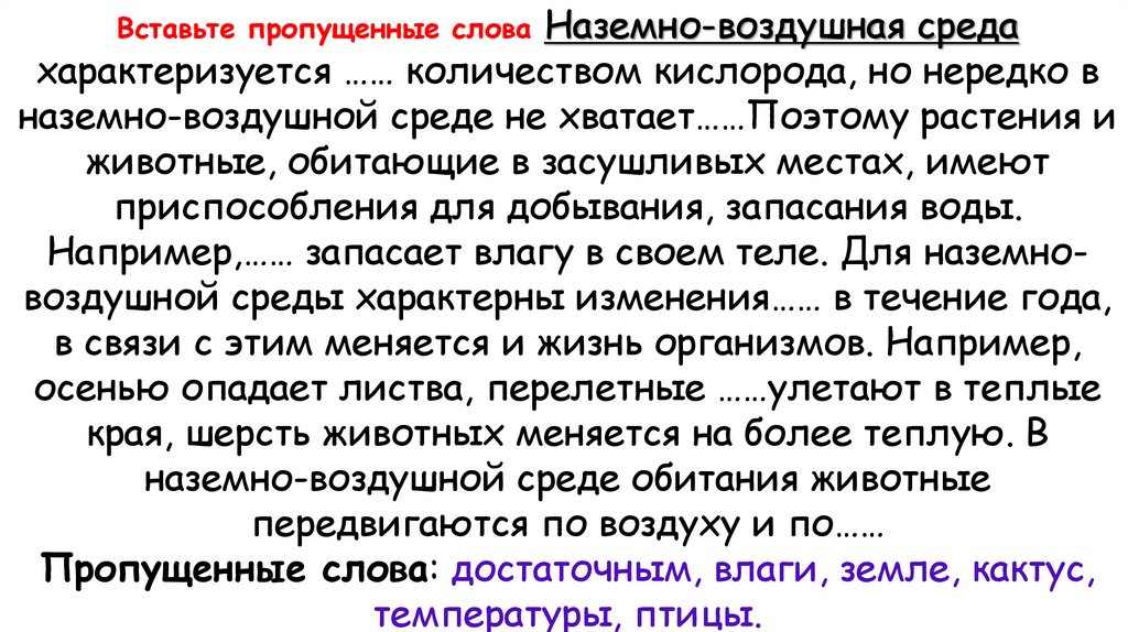 Вставьте пропущенные слова Наземно-воздушная средахарактеризуется …… количеством кислорода, но нередко в