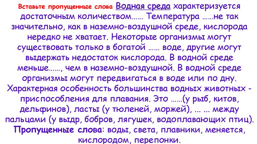 Вставьте пропущенные слова Водная среда характеризуетсядостаточным количеством…… Температура ……не так