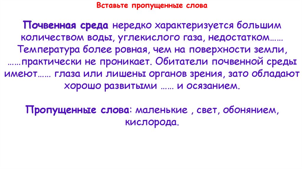 Вставьте пропущенные словаПочвенная среда нередко характеризуется большим