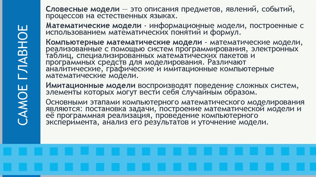САМОЕ ГЛАВНОЕСловесные модели — это описания предметов, явлений, событий,