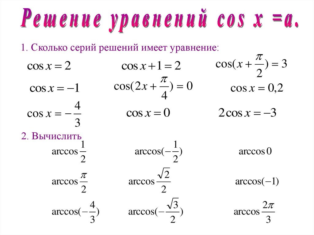 1. Сколько серий решений имеет уравнение:cos x 2