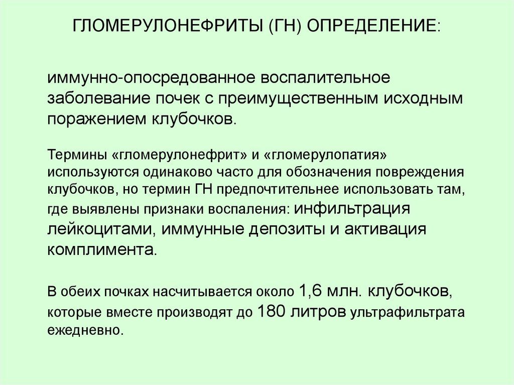 ГЛОМЕРУЛОНЕФРИТЫ (ГН) ОПРЕДЕЛЕНИЕ:иммунно-опосредованное воспалительное