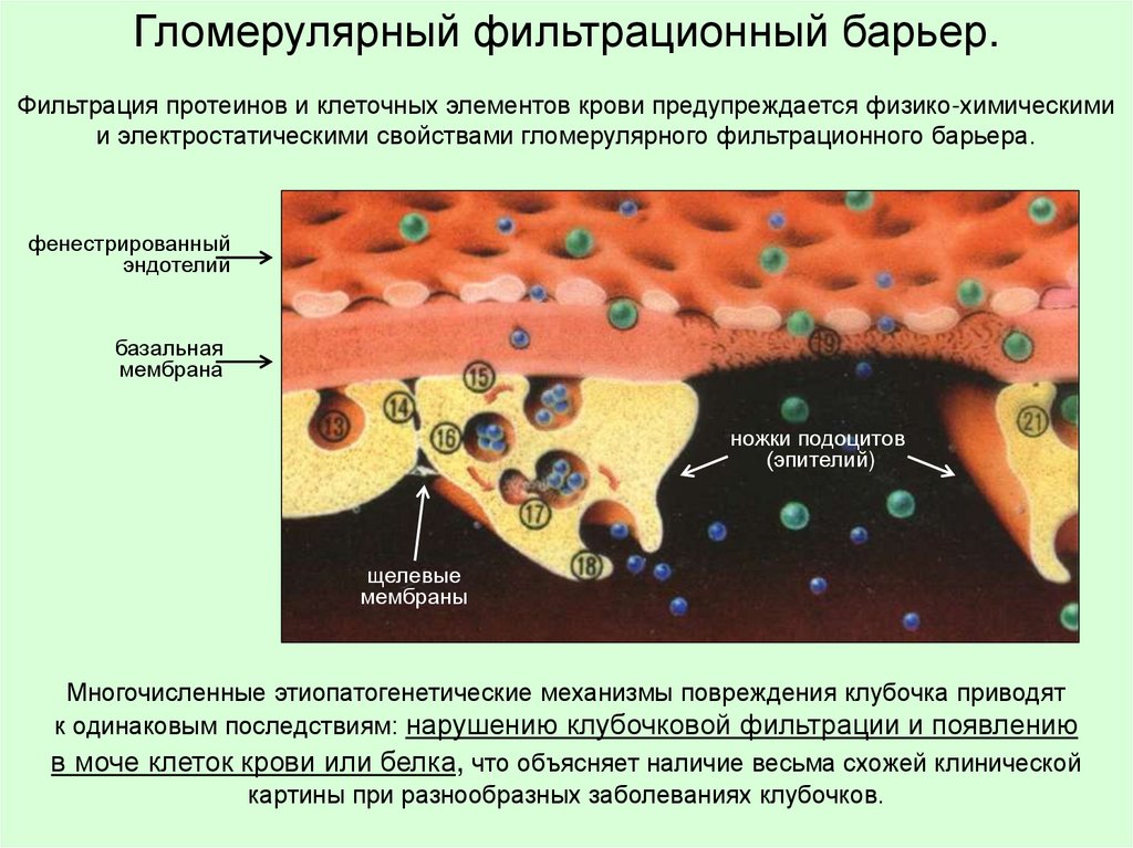 Гломерулярный фильтрационный барьер.Фильтрация протеинов и клеточных элементов крови предупреждается физико-химическими