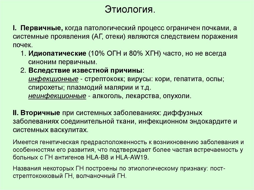 Этиология.I. Первичные, когда патологический процесс ограничен почками, а