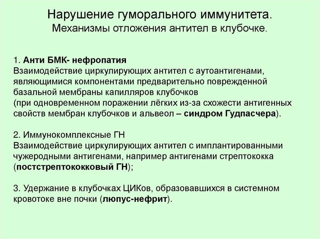 Нарушение гуморального иммунитета.Механизмы отложения антител в клубочке.