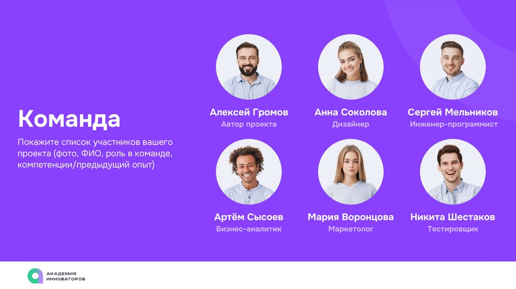 проекта (фото, ФИО, роль в команде,