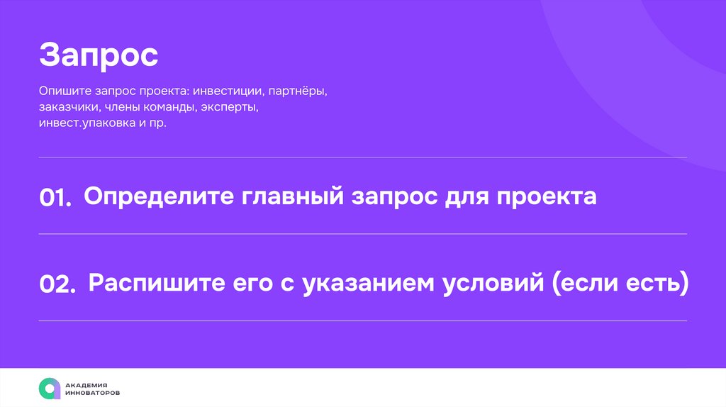 ЗапросОпишите запрос проекта: инвестиции, партнёры,