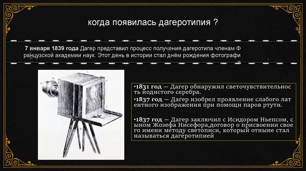 когда появилась дагеротипия ?7 января 1839 года Дагер представил процесс получения дагеротипа членам Ф