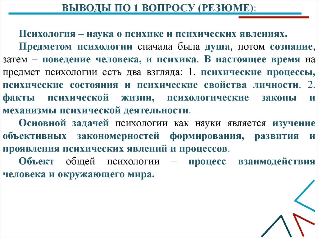 ВЫВОДЫ ПО 1 ВОПРОСУ (РЕЗЮМЕ):Психология – наука о психике и психических явлениях.