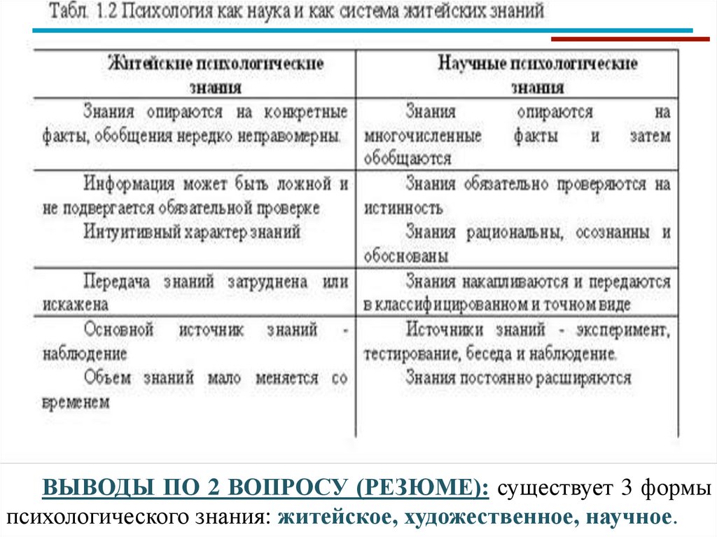 ВЫВОДЫ ПО 2 ВОПРОСУ (РЕЗЮМЕ): существует 3 формыпсихологического знания: житейское, художественное, научное.