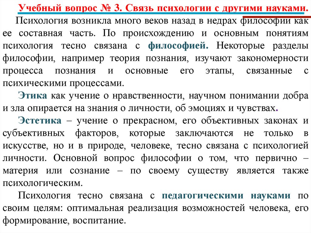 Учебный вопрос № 3. Связь психологии с другими науками.Психология возникла много веков назад в недрах философии как