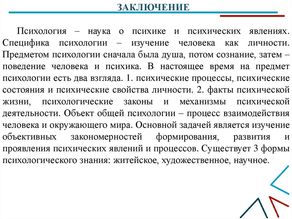 ЗАКЛЮЧЕНИЕПсихология – наука о психике и психических явлениях.