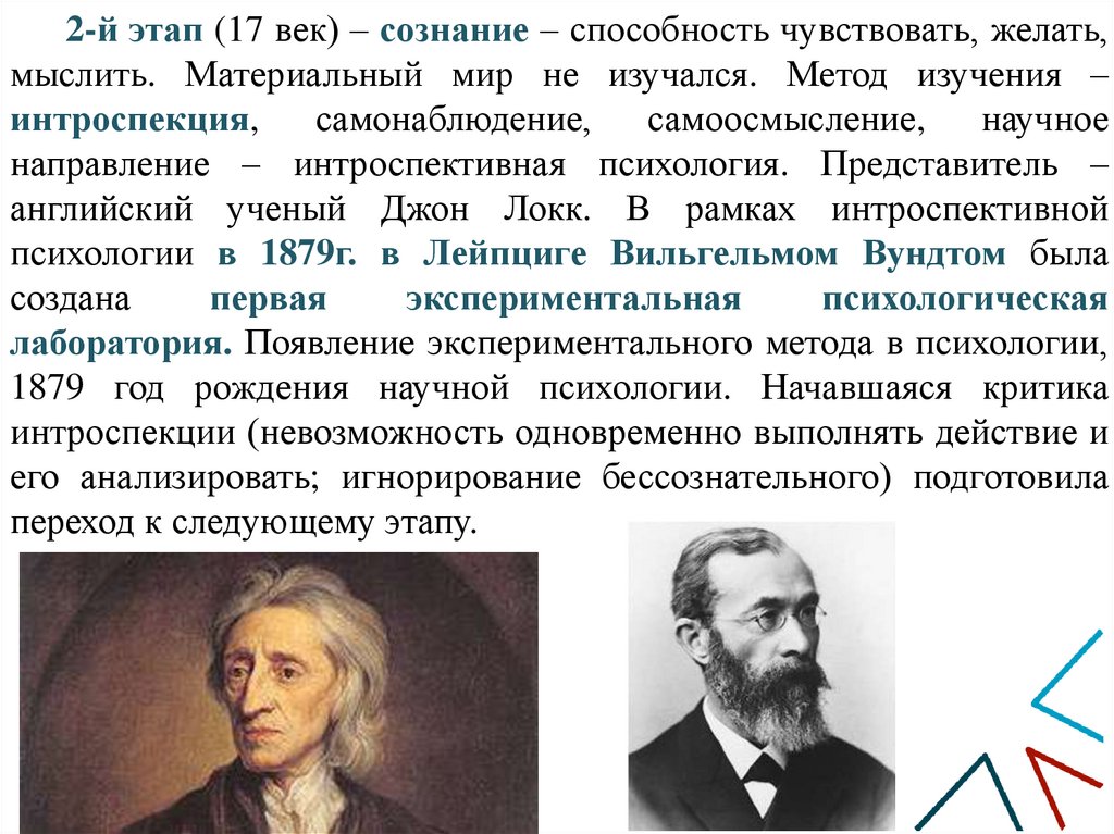 2-й этап (17 век) – сознание – способность чувствовать, желать,мыслить. Материальный мир не изучался. Метод изучения –
