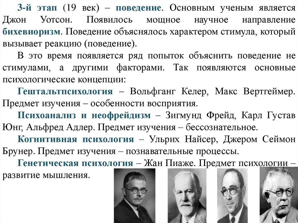 3-й этап (19 век) – поведение. Основным ученым являетсяДжон Уотсон. Появилось мощное научное направление