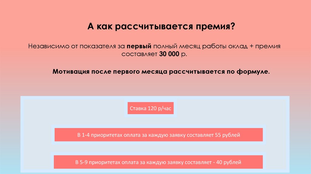 А как рассчитывается премия?Независимо от показателя за первый полный месяц работы оклад + премия