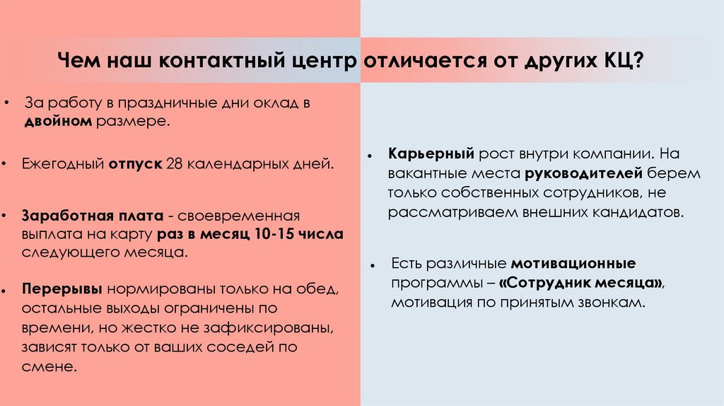 Чем наш контактный центр отличается от других КЦ?• За работу в праздничные дни оклад в