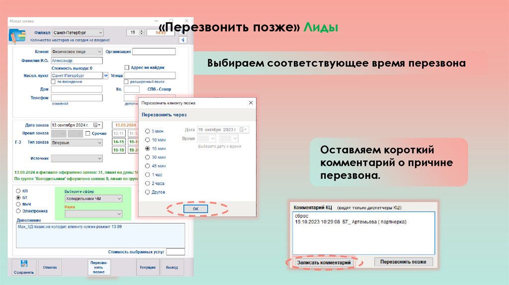 «Перезвонить позже» ЛидыВыбираем соответствующее время перезвона