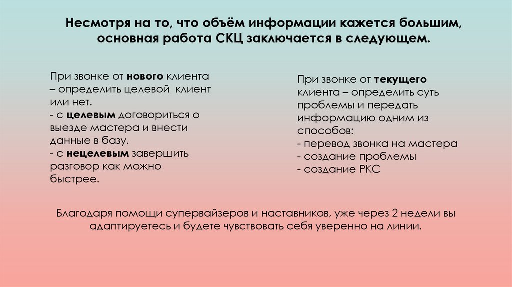 Несмотря на то, что объём информации кажется большим,основная работа СКЦ заключается в следующем.