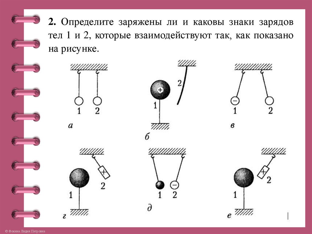 2. Определите заряжены ли и каковы знаки зарядовтел 1 и 2, которые взаимодействуют так, как показано