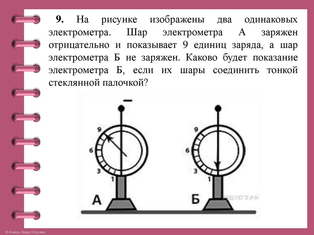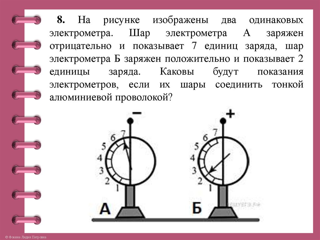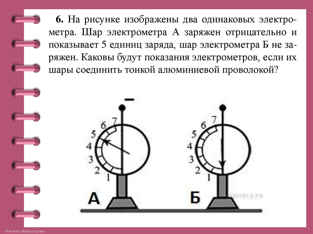 6. На рисунке изображены два одинаковых электрометра. Шар электрометра А заряжен отрицательно ипоказывает 5 единиц заряда, шар электрометра Б не заряжен. Каковы будут показания электрометров, если их