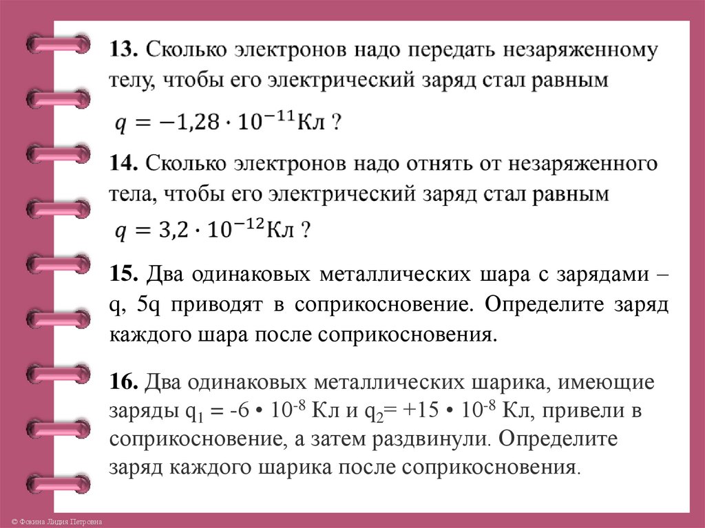 15. Два одинаковых металлических шара с зарядами –q, 5q приводят в соприкосновение. Определите заряд