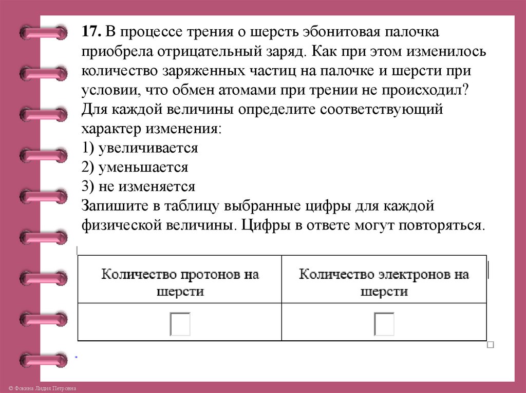 17. В процессе трения о шерсть эбонитовая палочкаприобрела отрицательный заряд. Как при этом изменилось