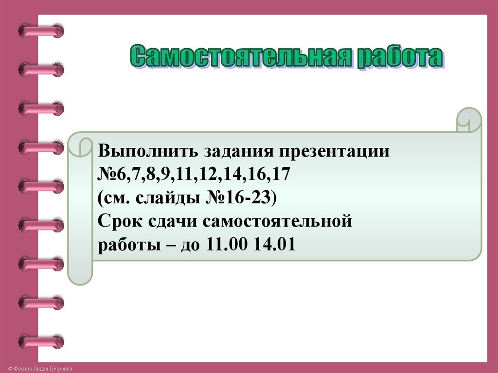 Выполнить задания презентации№6,7,8,9,11,12,14,16,17