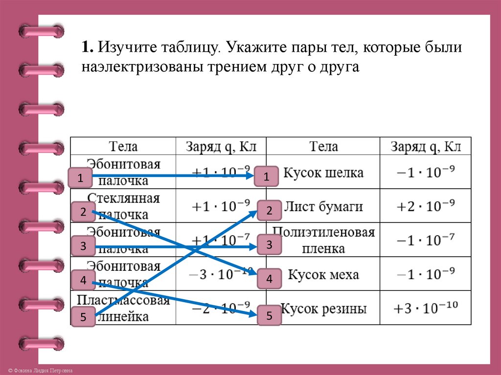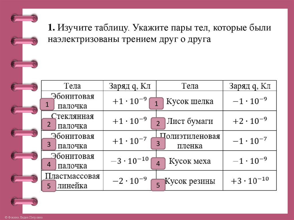 1. Изучите таблицу. Укажите пары тел, которые былинаэлектризованы трением друг о друга