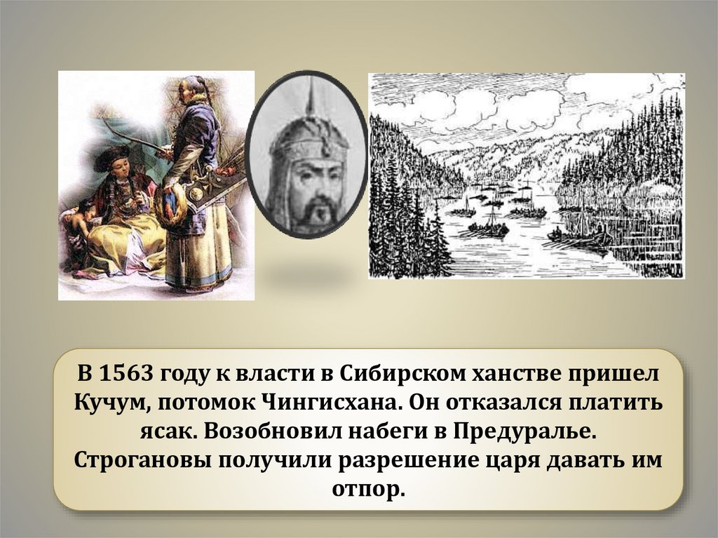 В 1563 году к власти в Сибирском ханстве пришелКучум, потомок Чингисхана. Он отказался платить