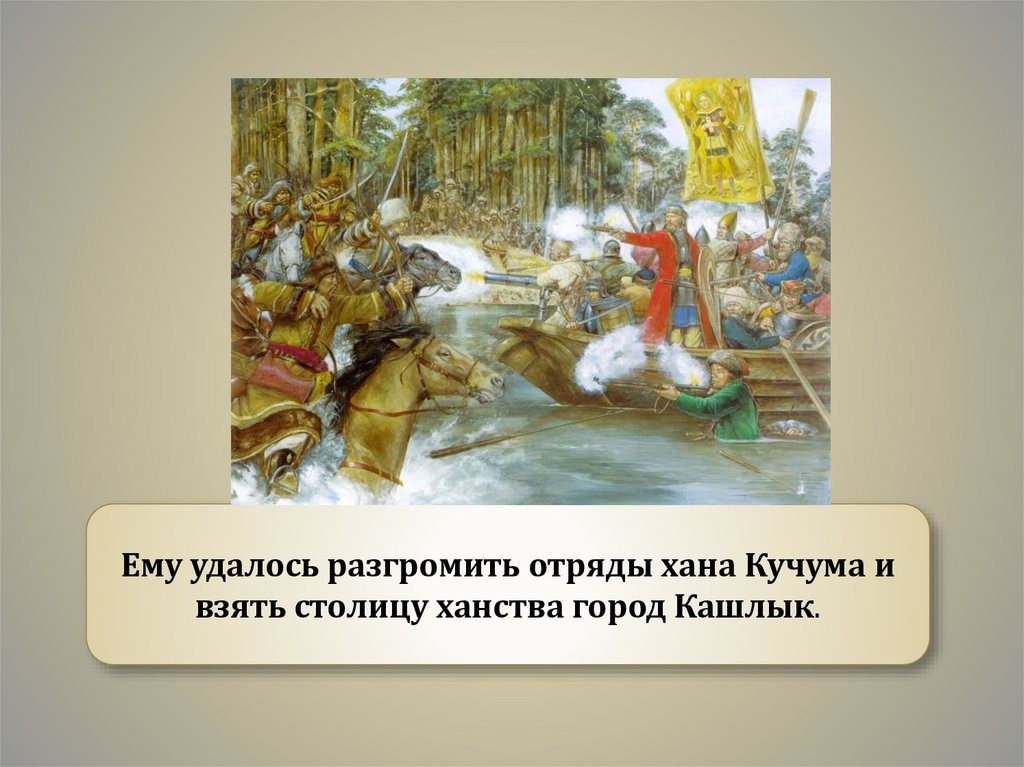 Ему удалось разгромить отряды хана Кучума ивзять столицу ханства город Кашлык.