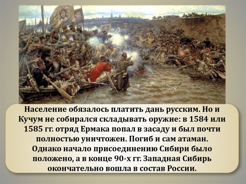 Население обязалось платить дань русским. Но иКучум не собирался складывать оружие: в 1584 или