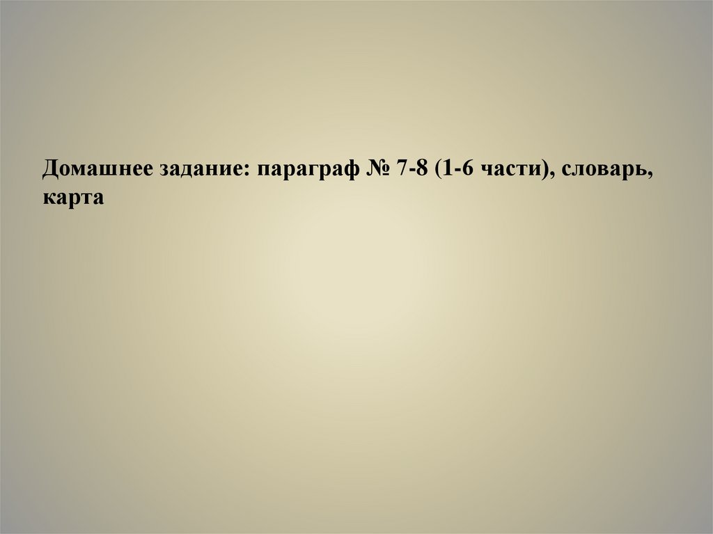 Домашнее задание: параграф № 7-8 (1-6 части), словарь,карта