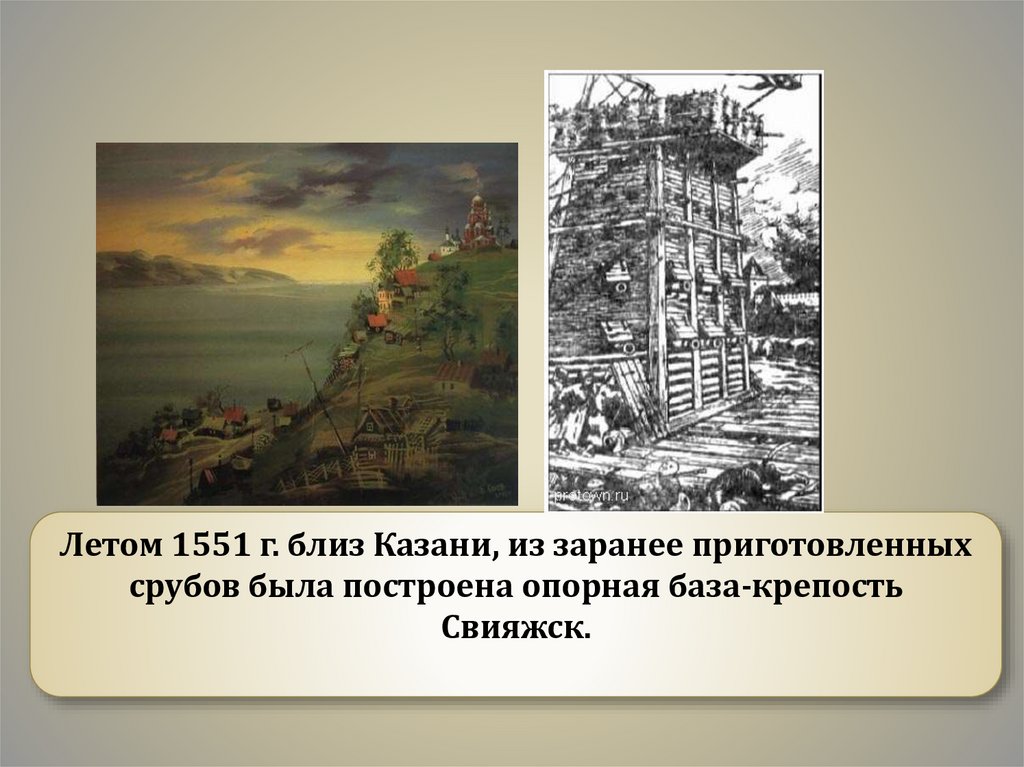 Летом 1551 г. близ Казани, из заранее приготовленныхсрубов была построена опорная база-крепость
