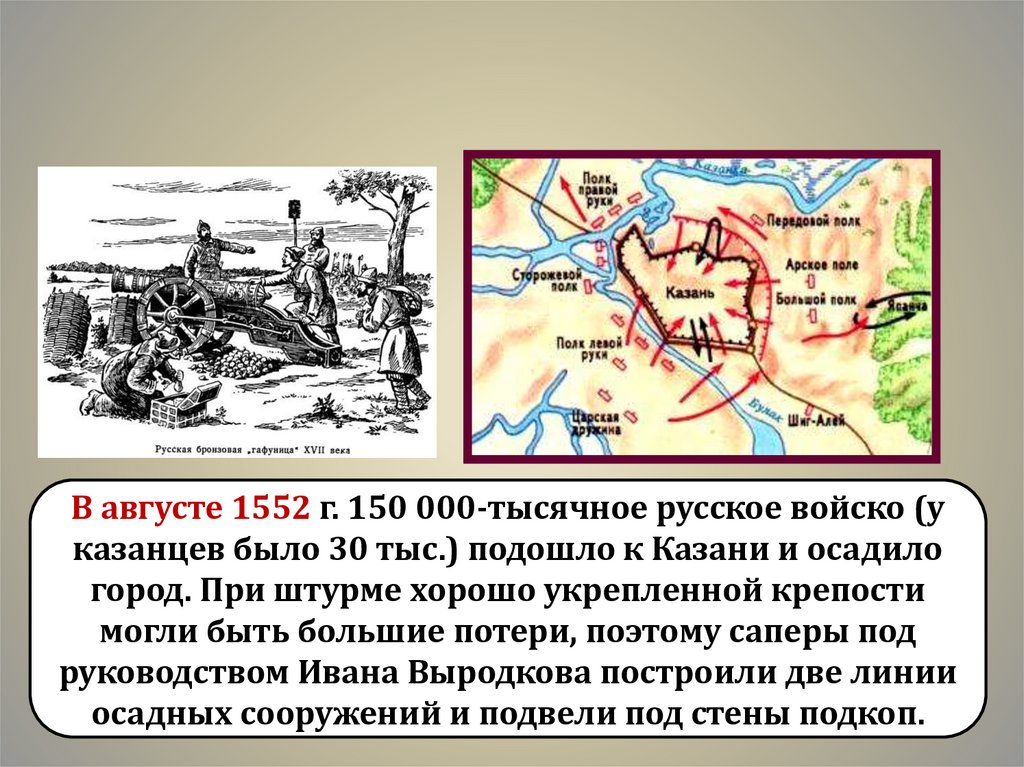 В августе 1552 г. 150 000-тысячное русское войско (указанцев было 30 тыс.) подошло к Казани и осадило