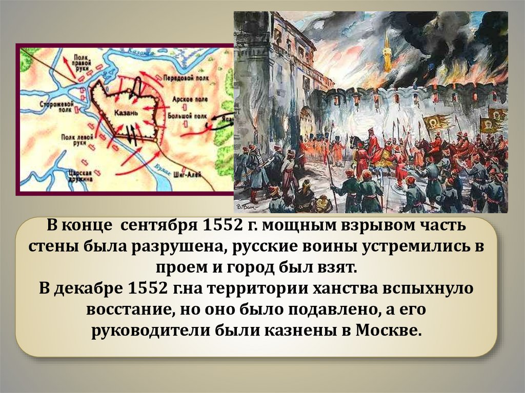 В конце сентября 1552 г. мощным взрывом частьстены была разрушена, русские воины устремились в