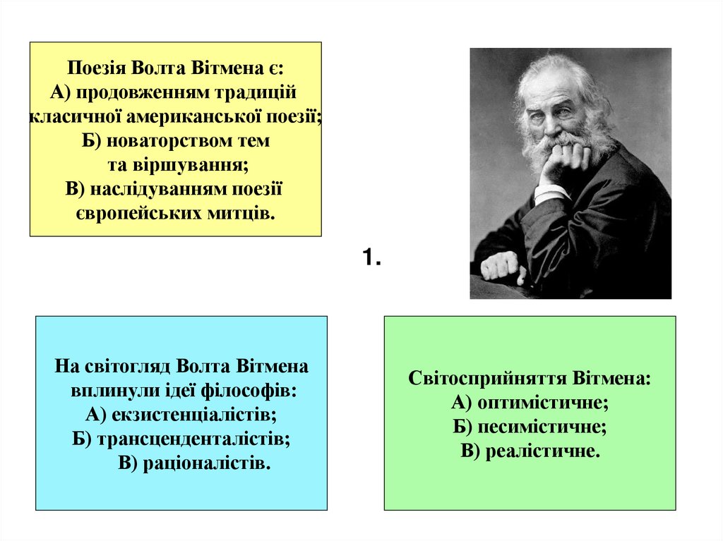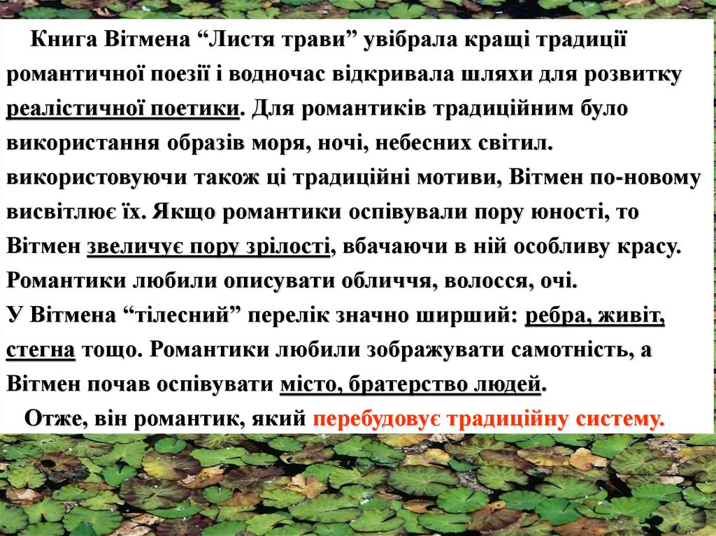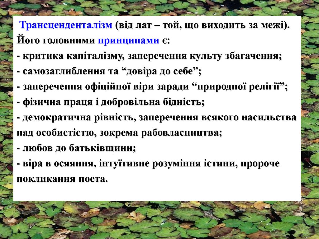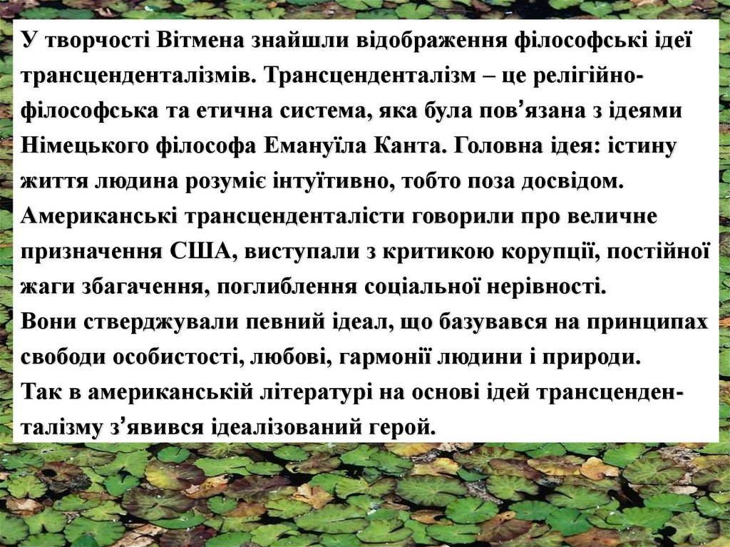 У творчості Вітмена знайшли відображення філософські ідеїтрансценденталізмів. Трансценденталізм – це релігійнофілософська та етична система, яка була пов’язана з ідеями