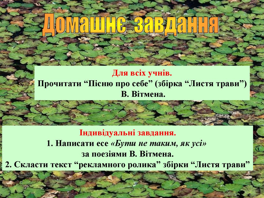 Для всіх учнів.Прочитати “Пісню про себе” (збірка “Листя трави”)