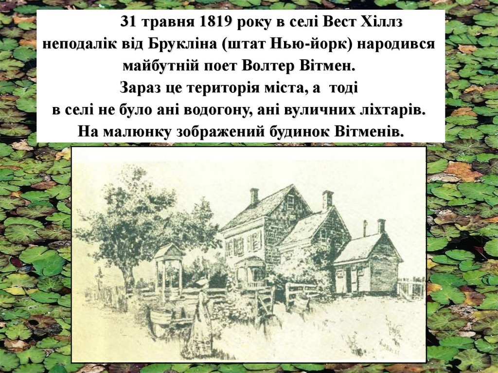 31 травня 1819 року в селі Вест Хіллзнеподалік від Брукліна (штат Нью-йорк) народився